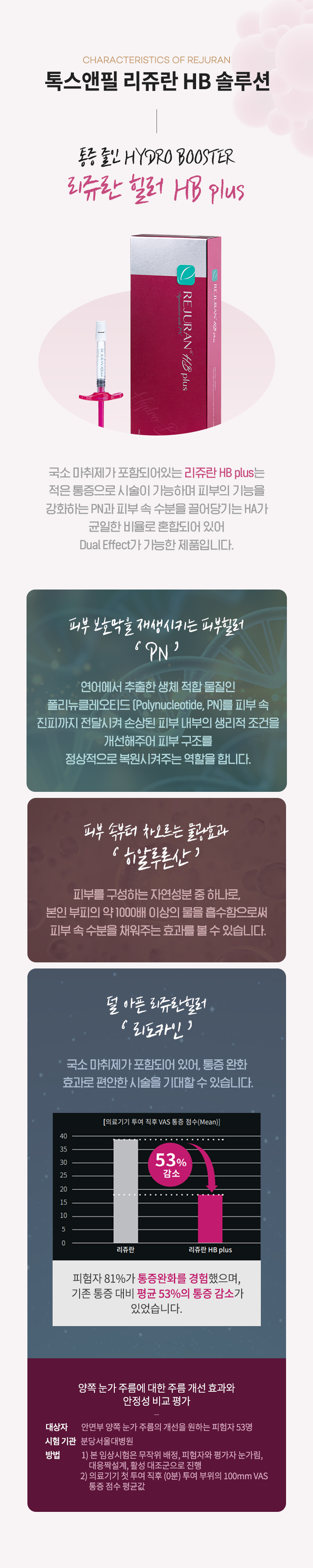 리쥬란 HB plus는 기존 리쥬란힐러에 히알루론산과 국소마취제를 더한 업그레이드 버전의 제품입니다.