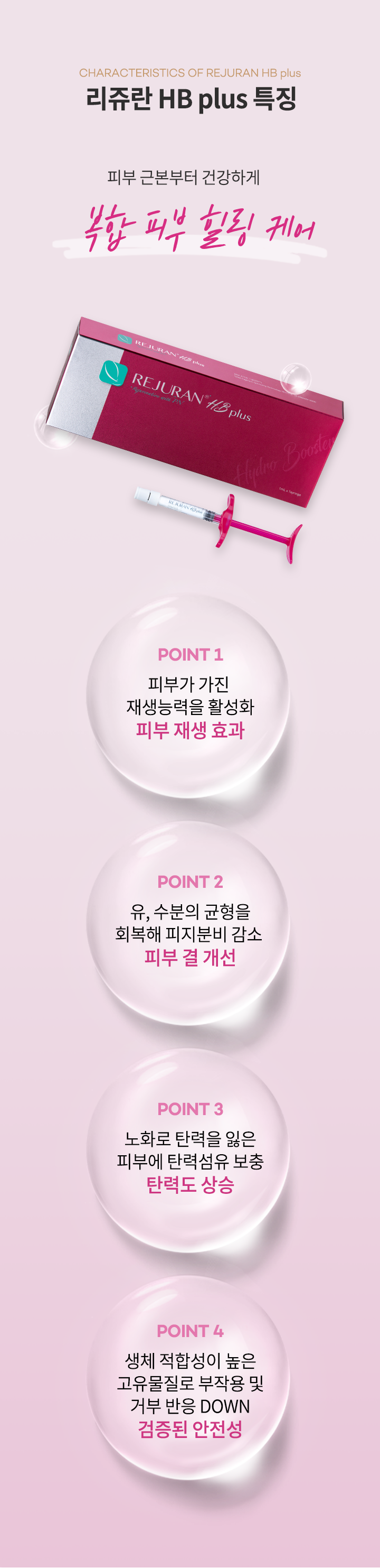 리쥬란 HB plus는 오리지널 리쥬란힐러와 히알루론산, 리도카인으로 이루어진 업그레이드 버전의 리쥬란 힐러입니다. 피부 세포 속부터 재생시켜주며 손상된 피부 내부의 생리적 조건을 개선하여 깊이감 있는 아름다움을 이끌어낼 수 있습니다.